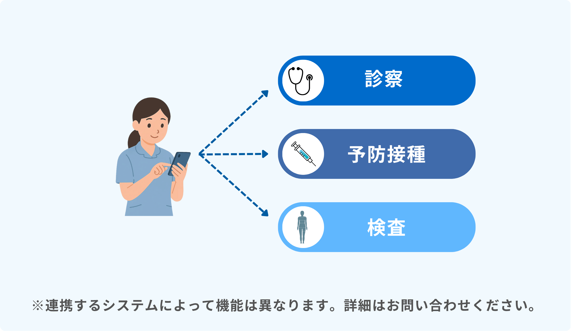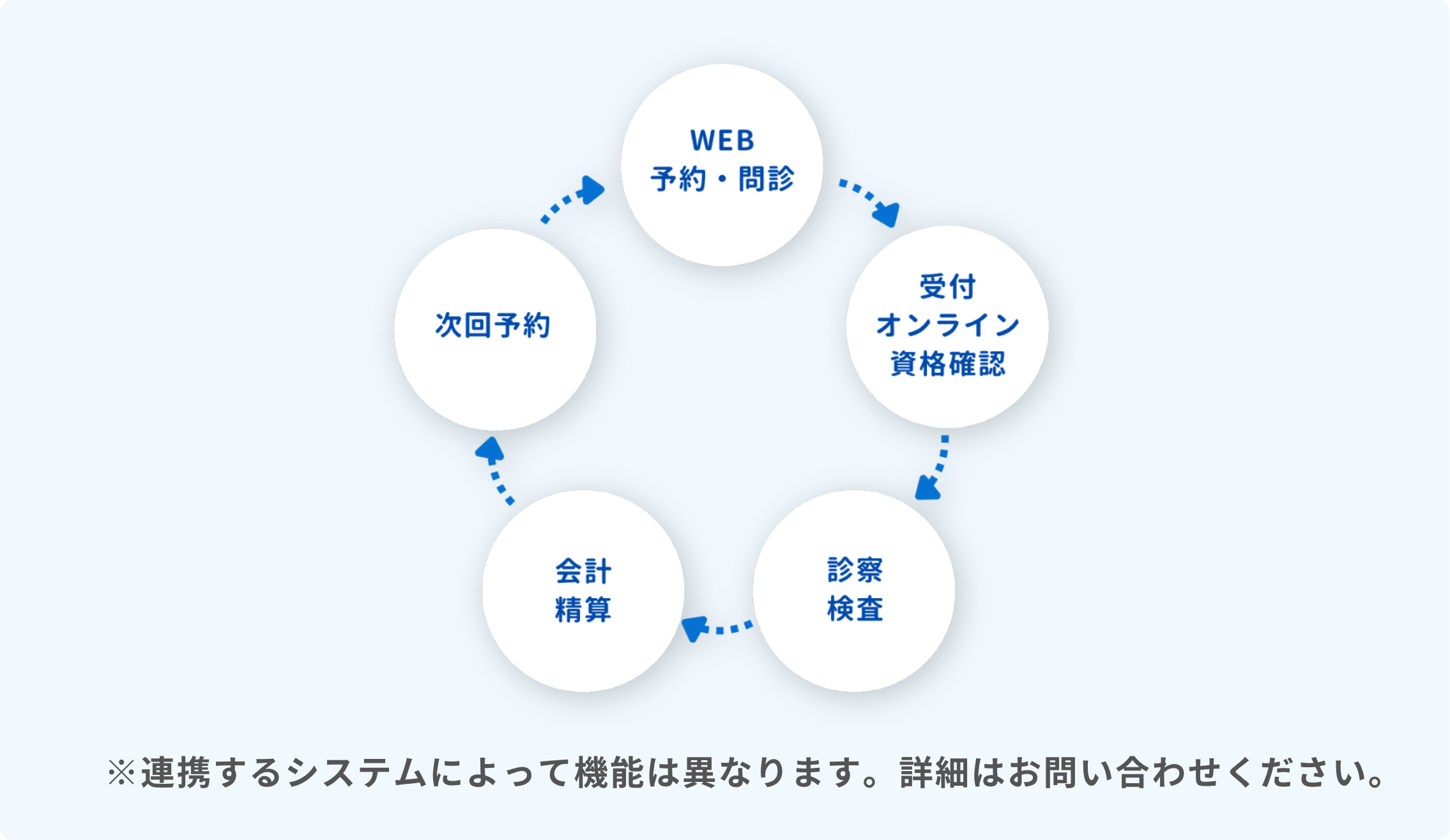 複数の外部ベンダーと連携し、高度なWeb予約・問診機能をご利用いただけます。患者がスマートフォンから予約・問診を完了し、その情報が自動で電子カルテに反映します。受付・診療・再診案内までを一気通貫でつなぐことで、再診率の向上し、医療スタッフの事務負担を軽減、患者の待ち時間の大幅に短縮も実現します。(本ページでは「高度な予約」「受付から再診までを自動化」「複雑な予約への対応」の内容をご紹介しております。)